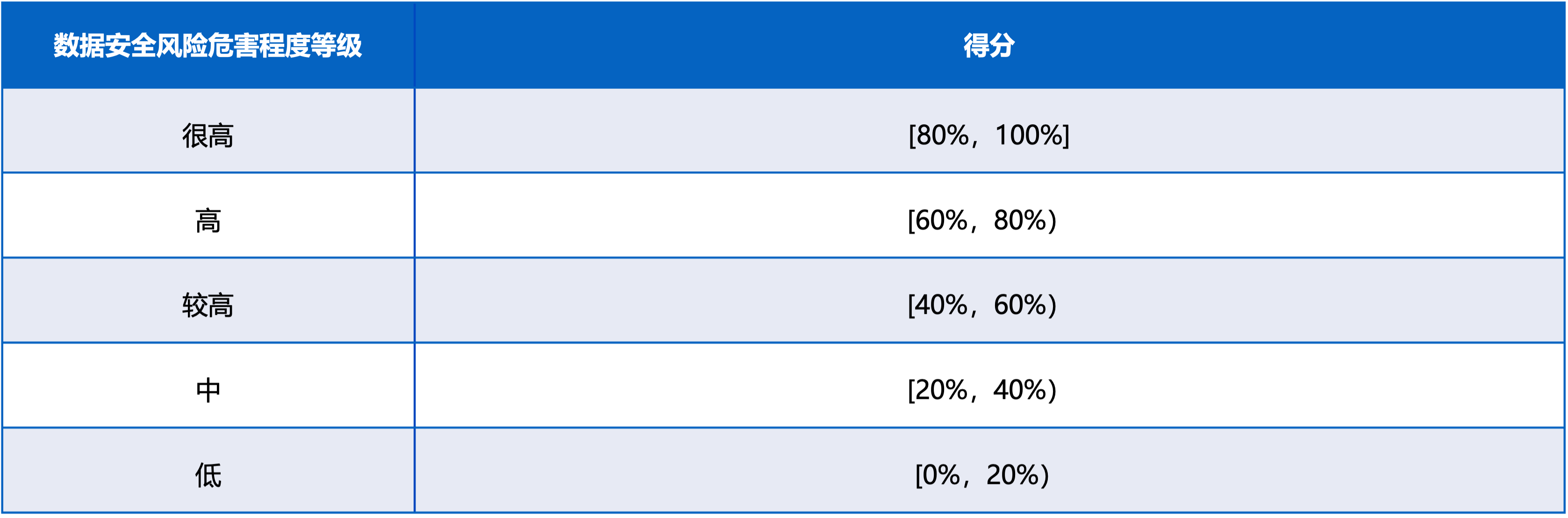 數(shù)據(jù)安全風(fēng)險(xiǎn)危害程度分析主要考慮數(shù)據(jù)價(jià)值、風(fēng)險(xiǎn)源嚴(yán)重程度等因素,結(jié)合數(shù)據(jù)級(jí)別、規(guī)模、種類、處理目的、方式、范圍等情況,綜合分析數(shù)據(jù)安全風(fēng)險(xiǎn)一旦發(fā)生,對(duì)國家安全、公共利益、組織或者個(gè)人合法權(quán)益造成的危害程度,將風(fēng)險(xiǎn)危害程度從低到高劃分為低、中、較高、高、很高5個(gè)等級(jí)。